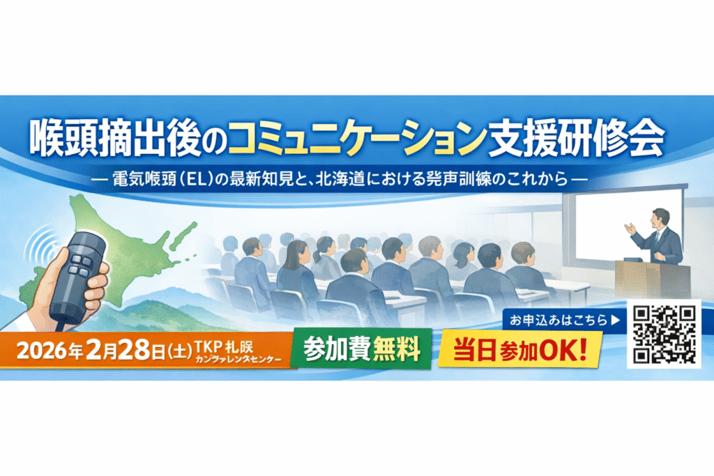 本研修会では、電気喉頭(EL)の国内トップメーカーである 株式会社電制コムテック をお招きし、最新機器の知見を深めるとともに、導入・指導のポイントを臨床の視点で学びます。あわせて、今後の 北海道 における発声訓練のあり方について意見交換を行い、地域のネットワークづくりにつなげます。